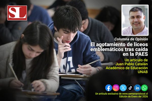 enero 7, 2026 Excelencia sin alma: el agotamiento de liceos emblemáticos tras caída en la PAESDurante décadas, los liceos emblemáticos se sostuvieron sobre una idea estrecha de calidad: selección temprana, alta exigencia y resultados medibles. Leer Más Al día, Educación, Nacional, Opinión #SemanarioLocal, Información, Juan Pablo Catalán Cueto, Noticias, Región de los Lagos, Semanario Local