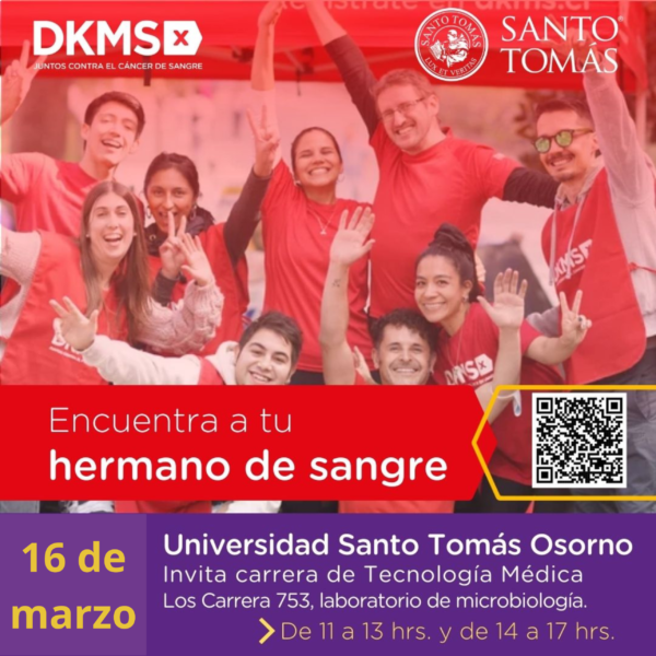 La carrera Tecnología Médica de Santo Tomás Osorno, junto a la Fundación de Beneficencia Pública DKMS, organizan para este jueves 16 de marzo, una jornada denominada “Encuentra a tu Hermano de Sangre”, en la cual la persona se registra como potencial donante de células madre sanguíneas con la esperanza de ayudar a salvar la vida de muchas personas en la lucha contra el cáncer de sangre.