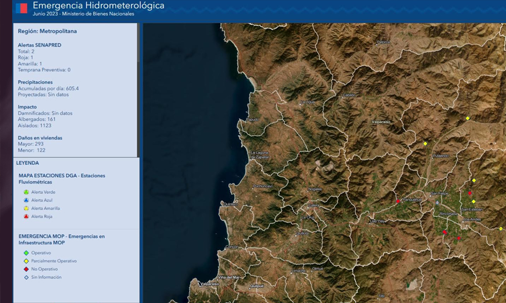 Ante la emergencia ocasionada por el sistema frontal que afecta a la zona centro sur del país, el Ministerio de Bienes Nacionales, a través de la Infraestructura de Datos Geoespaciales de Chile, IDE Chile, publicó un visor territorial con información georreferenciada de algunos efectos de las lluvias y desborde de ríos.