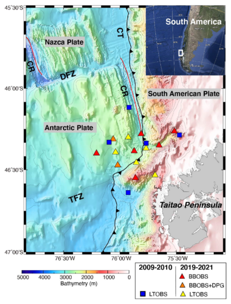 El resultado –publicado hace algunas semanas en el Journal of South American Earth Sciences- fue la detección de más de 2.100 sismos locales, de magnitudes entre -0,3 y 5. Los terremotos ocurrieron de manera activa a lo largo de la Dorsal de Chile y en la Zona de Fractura de Darwin, que es el área donde se “rozan” las placas Antártica y de Nazca, antes de subducir bajo la Placa Sudamericana. “Allí existe una brecha sísmica en los 46.4° Sur, es decir, es una zona desde donde se diferencia claramente el tipo predominante de falla, si ésta se ubica hacia el sur o hacia el norte de esta división”, explica el artículo científico.