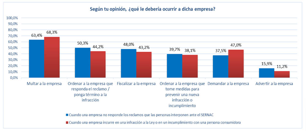 Un 63,4% de los consultados señalan que deberían ser multadas; un 50,3% indicó que se debería ordenar a la empresa a responder; y un 48% se le debería fiscalizar.