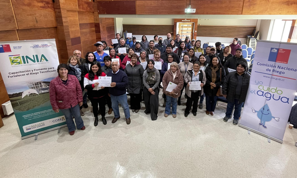 Más de 40 productores agrícolas y profesionales del agro de las comunas de San Juan de la Costa y Río Negro en la Región de Los Lagos recibieron certificados de participación en el Programa de Capacitación de Riego llevado a cabo por la Comisión Nacional de Riego (CNR) y el Instituto de Investigaciones Agropecuarias (INIA), con el apoyo y financiamiento del Gobierno Regional de Los Lagos.