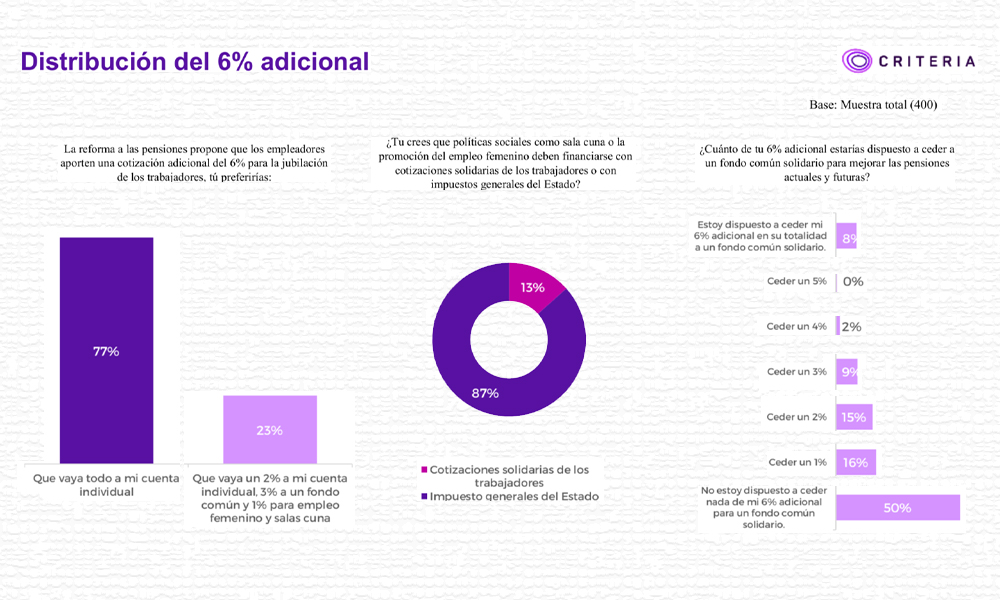 Estas cifras contrastan con las ideas matrices planteadas por el gobierno en su proyecto de reforma de pensiones, que propone un 3% a cuentas individuales y un 3% a un seguro social (o reparto). Además, un 46% evalúa la reforma como mala o muy mala.