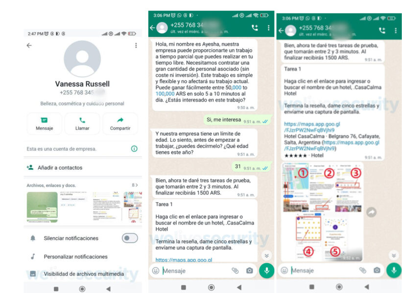 Las víctimas son contactadas aleatoriamente por WhatsApp desde números desconocidos —incluso de países lejanos— para efectuar reseñas de hoteles, con el objetivo de aumentar su reputación en línea. Entablan contacto con un representante, que brinda los detalles del trabajo para comenzar a ganar dinero de inmediato.