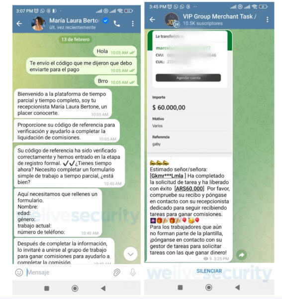 Una vez en Telegram, una supuesta recepcionista se presenta como la persona que acompañará el proceso de pago de la comisión por las tareas completadas. Allí, indicará a la víctima que es necesario unirse a un grupo de trabajo, para así ganar comisiones por nuevas tareas.