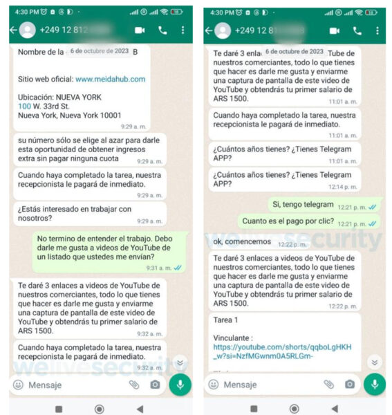 El estafador comenta que el número de teléfono fue elegido al azar y brinda algunos detalles de la oferta. Al igual que en la estafa que utiliza Google Maps como señuelo, en el caso de YouTube el estafador también indica diversas tareas para completar y propone continuar con el proceso a través de Telegram.