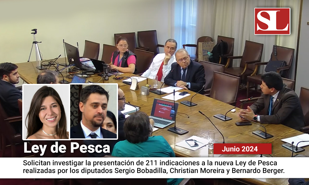 Los diputados del PS Daniella Cicardini y Daniel Manouchehri solicitaron en la Comisión de Pesca de la Cámara de Diputados investigar la presentación de 211 indicaciones a la nueva Ley de Pesca realizadas por los diputados Sergio Bobadilla, Christian Moreira y Bernardo Berger. Según consta una nota de Ciper Chile, son una réplica de propuestas realizadas por la gremial empresarial Sonapesca, mediante un informe técnico-jurídico que puso a disposición de la Comisión el pasado 2 de mayo.