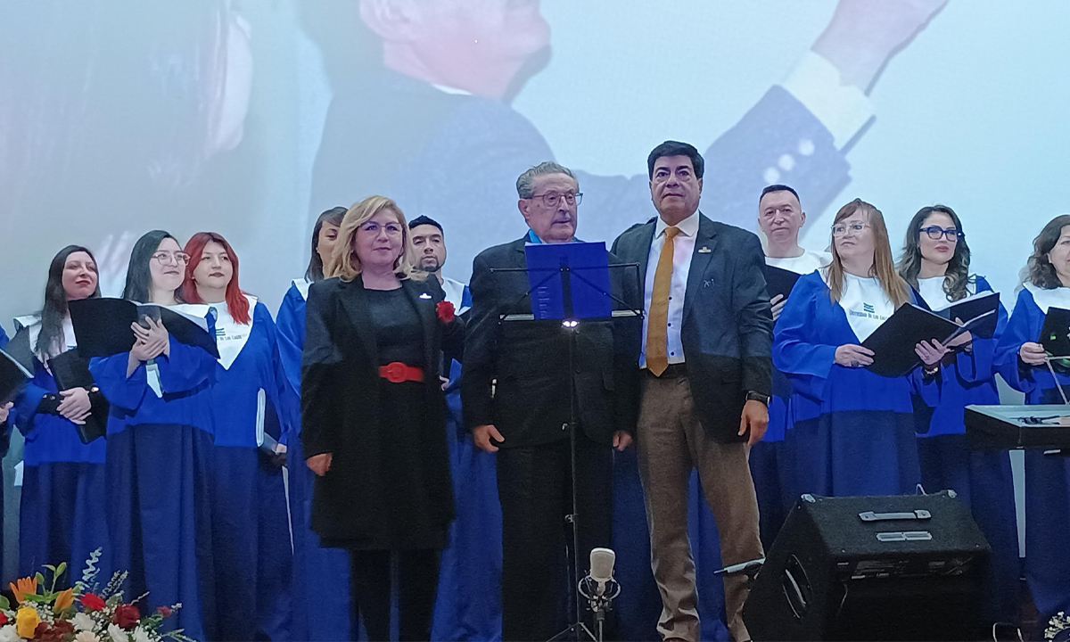 Con la interpretación del coro en el escenario fue el momento propicio para llamar al profesor Burgos a subir hasta él y entregarle una medalla de manos del rector Óscar Garrido y de la prorectora Marcia Adams.