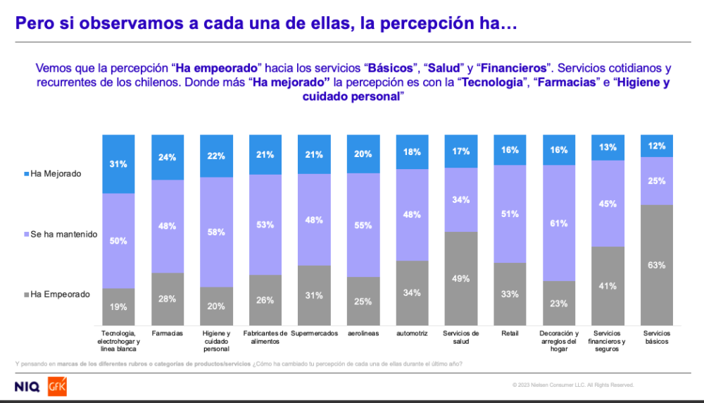 ¿Y en qué ha empeorado? La investigación señala que la percepción ha decaído principalmente en Servicios Básicos (63%), en Servicios de Salud (49%) y en Servicios Financieros (41%), todos servicios cotidianos y recurrentes de los chilenos y donde más ha mejorado la percepción de los consumidores es en Tecnología (31%), Farmacias (24%), Higiene y Cuidado personal (22%) y Aerolíneas (20%).