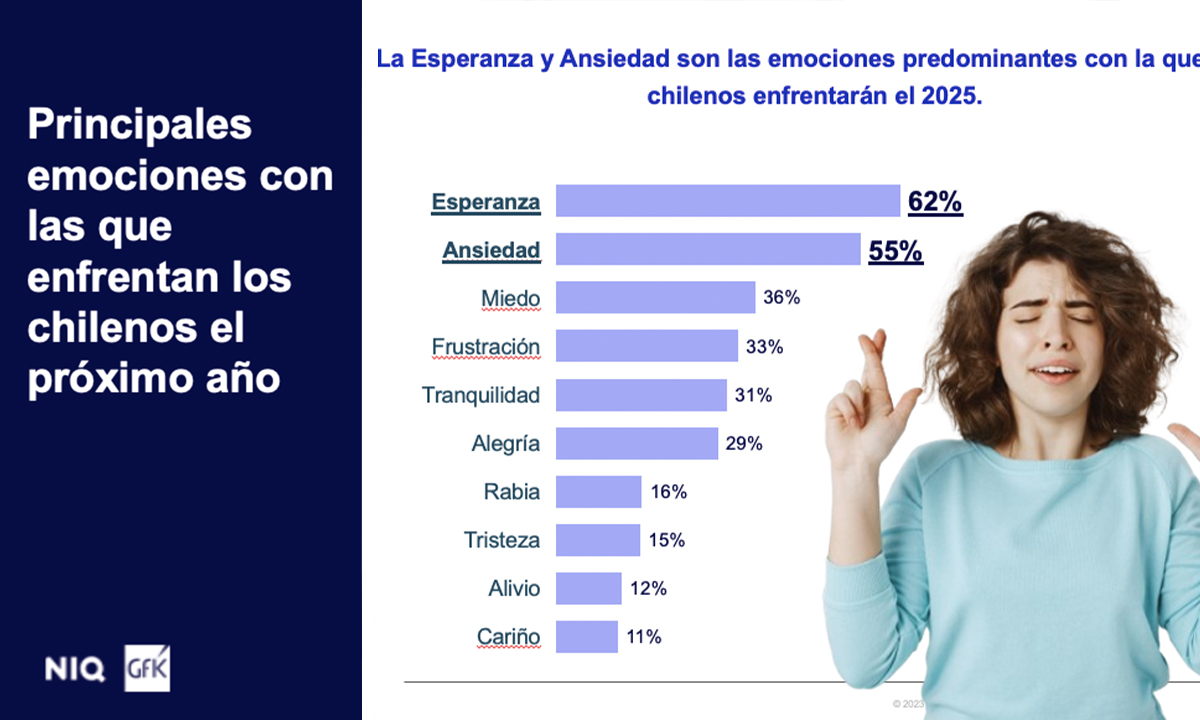 En este contexto, NIQ Chile se planteó la inquietud de cómo los chilenos enfrentarán emocionalmente el 2025 económico del país. La investigación arrojó que un 62% tiene esperanza respecto del próximo año en materia financiera, mientras que un 55% siente ansiedad con lo que pueda ocurrir. .