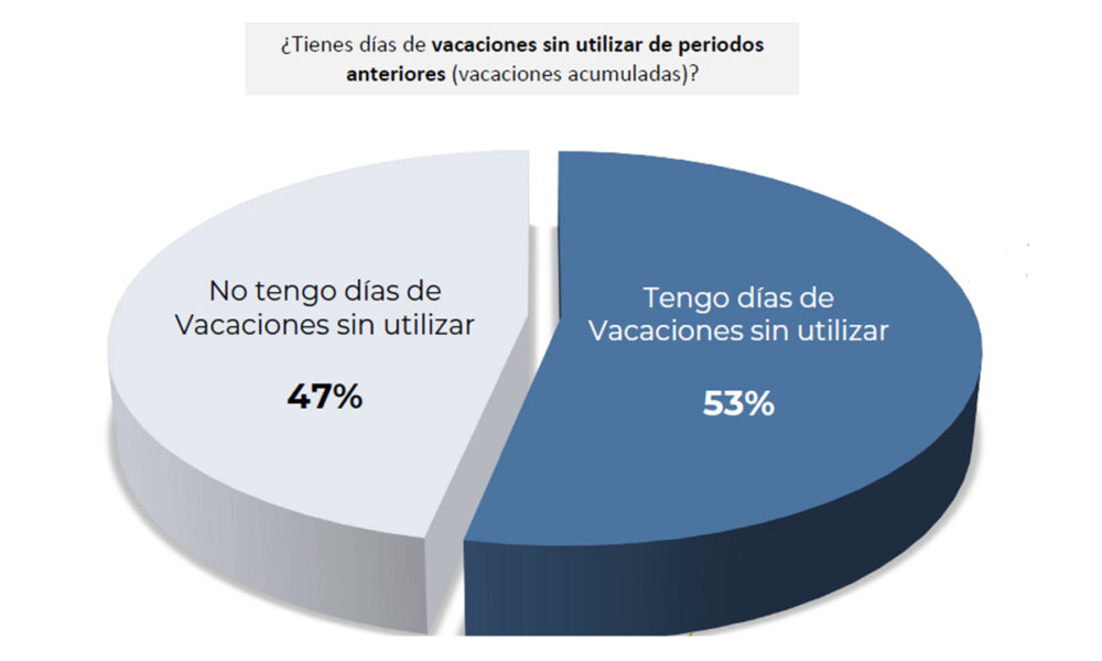 Según las experiencias de las personas trabajadoras, un 53% no utiliza sus días de vacaciones debido a factores como la decisión de acumularlos (38%), la falta de dinero (28%) o las exigencias laborales, como la escasez de personal (20%) y el exceso de trabajo (17%).
