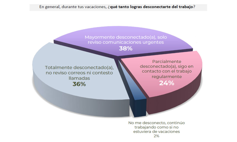 Además, un 26% afirma mantener una fuerte conexión con el trabajo en sus días libres, mientras que un 36% consigue lograr una desconexión total durante las vacaciones. Por otro lado, el 38% señala estar mayormente desconectado, aunque permanece atento a posibles urgencias. «La tecnología ha transformado la forma en que nos conectamos, brindándonos acceso inmediato al trabajo, correos, reuniones, redes sociales y otros canales, especialmente a través de dispositivos como los celulares. Esta hiperconexión también plantea el desafío de equilibrar el tiempo personal y laboral, sobre todo durante las vacaciones, cuando es clave respetar el descanso para favorecer el bienestar de los colaboradores», comenta Cinthya Ríos, jefa del Departamento de Psicología de Seguridad y Salud en el Trabajo de Mutual de Seguridad.