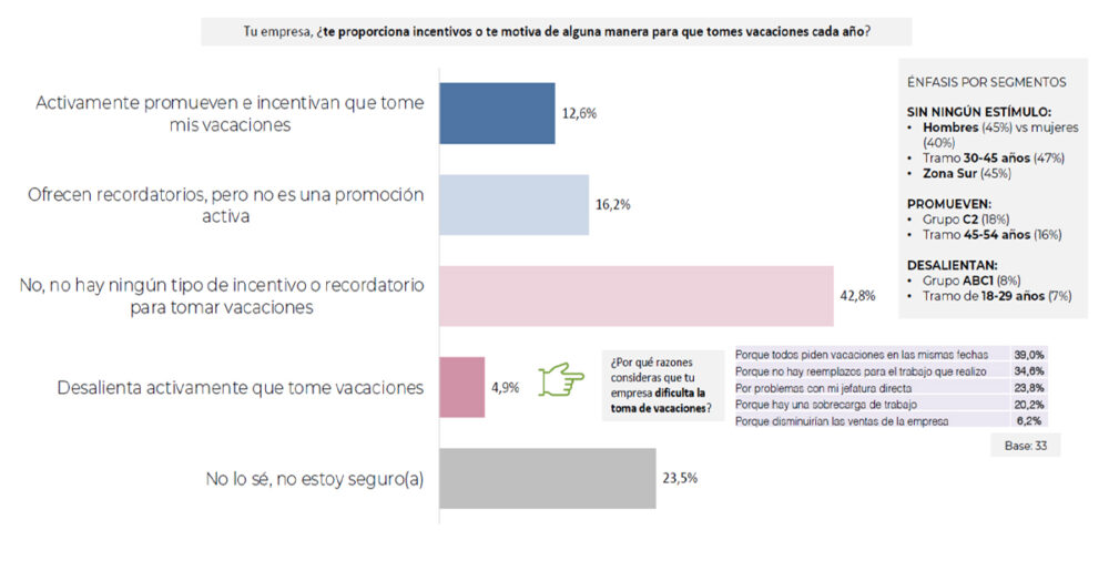 Finalmente, respecto a la actitud de los empleadores frente a las vacaciones, sólo el 13% de las personas trabajadoras perciben que su empresa da importancia a este aspecto. El 43% de los encuestados señala que no reciben incentivos ni recordatorios al respecto, mientras que un 5% percibe una actitud negativa que desalienta la toma de vacaciones.