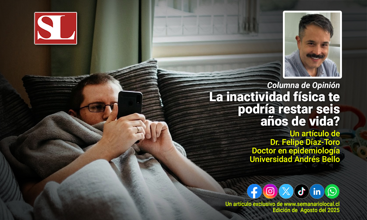 09 de Agosto del 2025.- Un estudio chileno entrega datos alarmantes, donde las personas que no realizan actividad física tienen un 62% más de riesgo de morir y pueden perder, en promedio, 5,8 años de vida en comparación con quienes cumplen con las recomendaciones mínimas de ejercicio.