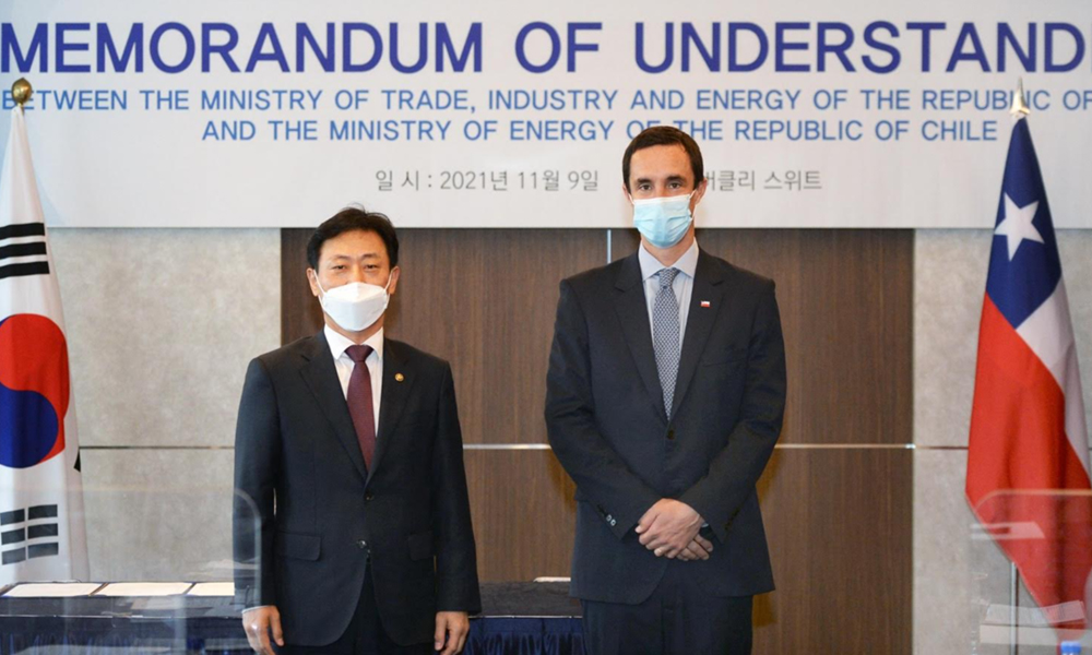 Seúl, Corea, noviembre de 2021. La Estrategia Nacional de hidrógeno verde suma un nuevo hito, y es que esta semana, desde Corea, el Ministro de Energía y Minería de Chile, Juan Carlos Jobet, junto al Ministro de Comercio, Industria y Energía, Moon Sung Wook y al segundo viceministro de Comercio, Industria y Energía de Corea del Sur Park Ki-young firmaron un Memorándum De Entendimiento (MoU por sus siglas en inglés), para compartir experiencias y conocimiento entre ambas naciones y así impulsar el despliegue de tecnologías de producción, almacenamiento, transporte distribución y utilización del hidrógeno verde.