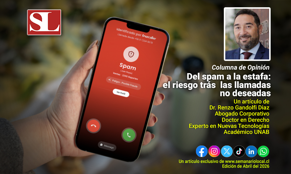26 de Abril del 2026.- Es preocupante la situación del spam telefónico en Chile, la cual no puede ser tratada como una simple molestia cotidiana, atendido que una persona recibe en promedio alrededor de 31 llamadas spam al mes, como han reportado distintos balances difundidos en 2025 a la fecha, así las cosas, estamos frente a un fenómeno que afecta la tranquilidad, la privacidad y la seguridad de la población. Chile, de hecho, lidera entre los países más afectados de América Latina por este tipo de llamadas de spam telefónico.