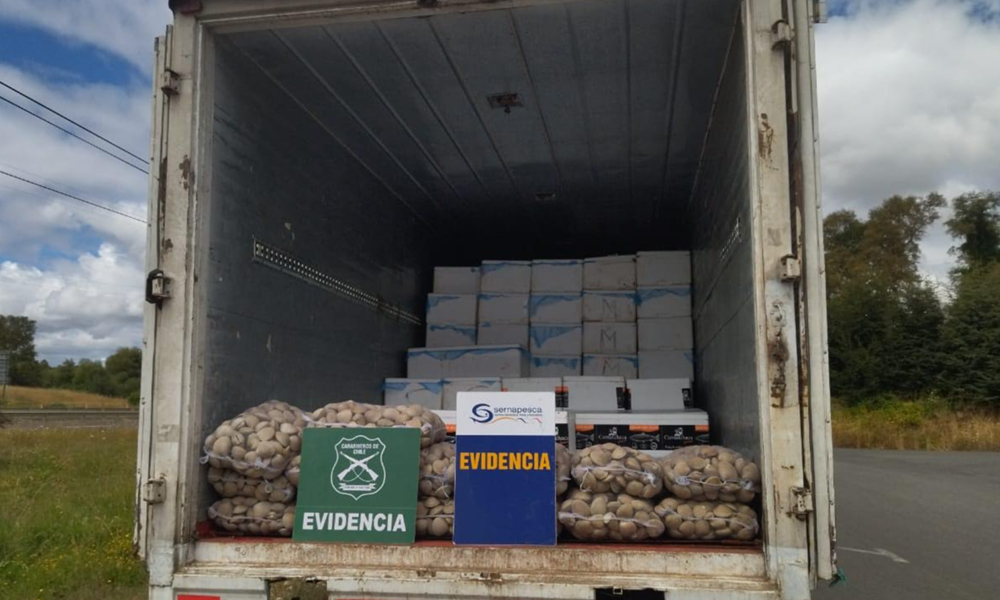 Durante control carretero el miércoles 16, funcionaria y funcionario del Servicio Nacional de Pesca y Acuicultura (Sernapesca) de la región de Los Lagos en conjunto con personal de Carabineros de la Tenencia de Carreteras de Osorno controlaron a camión proveniente de Chiloé que transportaba 4080 kilos de congrio dorado 1050 kilos de merluza del sur y 450 kilos de almejas, recursos frescos que no contaban con la documentación para acreditar el origen legal.