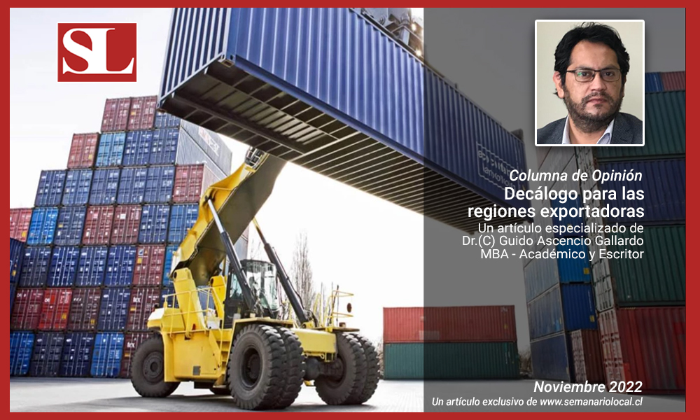 Esta propuesta de decálogo para potenciar la exportación en las regiones, se presenta como un punta pie inicial que se necesita, que debe ir acompañada con una mirada “desde adentro”, es decir con una descentralización de verdad, donde se le reconozca a las regiones la capacidad de pensarse a sí mismas, generando políticas públicas que fortalezcan la institucionalidad regional que hoy comienza a visibilizarse ante los diferentes escenarios de la sustentabilidad.