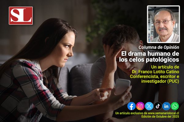 noviembre 9, 2025 El drama humano de los celos patológicosAlgunos estudios sugieren que la celotipia o celos patológicos afectan de manera desproporcionada a hombres mayores de 30 años. Leer Más Medicina y salud, Opinión, Psicología, Salud Mental, Sociedad #SemanarioLocal, Dr. Franco Lotito Catino, Información, Noticias, Osorno, Región de los Lagos, Semanario Local