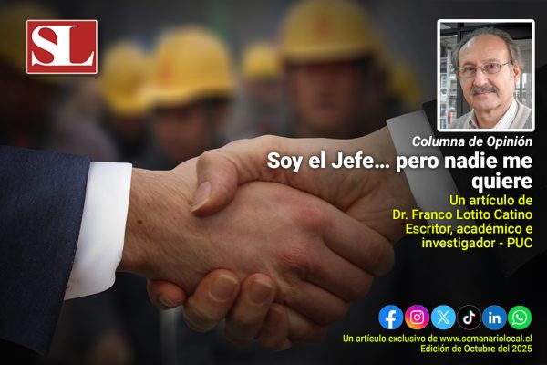 octubre 19, 2025 Soy el Jefe… pero nadie me quiere“Las personas no renuncian a las empresas, renuncian a los malos jefes”. Leer Más Al día, Opinión, Psicología #SemanarioLocal, Dr. Franco Lotito Catino, Información, Noticias, Región de los Lagos, Semanario Local