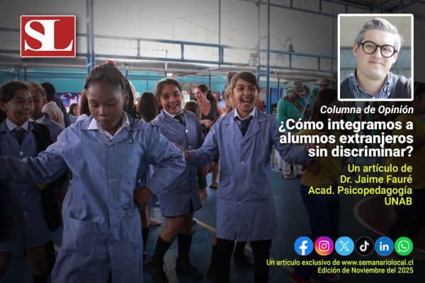 noviembre 20, 2025 ¿Cómo integramos a alumnos extranjeros sin discriminar?La pregunta no es si debemos integrar a estos estudiantes sino cómo lo hacemos sin reproducir la exclusión que tanto daño causa. Leer Más Educación, Nacional, Opinión, Sociedad #SemanarioLocal, Dr. Jaime Fauré Niñoles, Información, Noticias, Región de los Lagos, Semanario Local, Universidad Andrés Bello