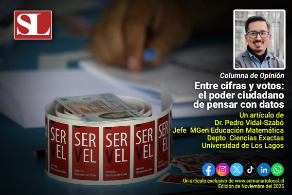 noviembre 16, 2025 Entre cifras y votos: el poder ciudadano de pensar con datosEste 16 de noviembre 2025, Chile vuelve a las urnas para elegir Presidente, Senadores en siete regiones y Diputados en todo el país. Leer Más Al día, Elecciones y Candidatos, Estado, Opinión, Partidos Políticos, Política #SemanarioLocal, Dr. Pedro Vidal-Szabó, Información, Noticias, Región de los Lagos, Semanario Local, Universidad de Los Lagos