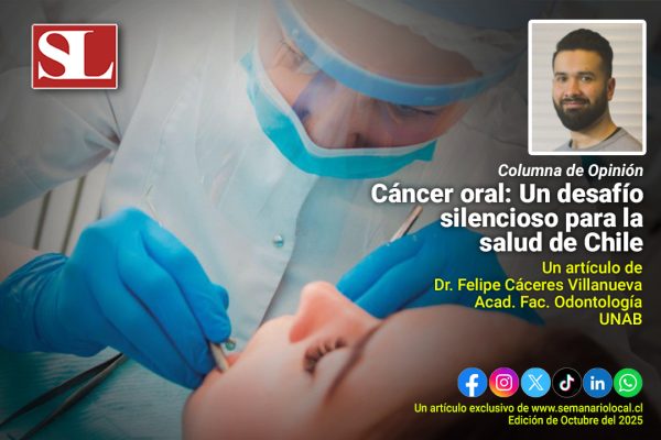 octubre 3, 2025 Cáncer oral: Un desafío silencioso para la salud de ChileEl cáncer oral no suele ocupar los titulares ni las conversaciones cotidianas. Sin embargo, representa una amenaza real. Leer Más Al día, Familia, Medicina y salud, Opinión, Salud #SemanarioLocal, Felipe Cáceres Villanueva, Información, Noticias, Osorno, Región de los Lagos, Semanario Local