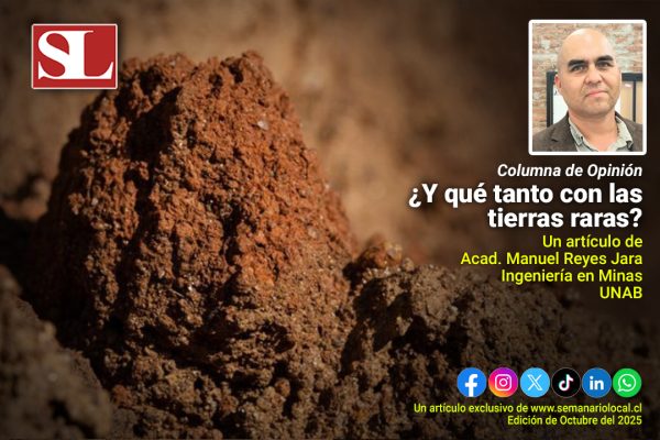 octubre 23, 2025 Bueno, ¿y qué tanto con las tierras raras?El auge del proyecto minero en Penco ha posicionado a las Tierras Raras (REE) en el debate nacional, generando un entusiasmo que merece ser contrastado con la realidad. Leer Más Al día, Especialista, Mineria, Nacional, Opinión #SemanarioLocal, Información, Noticias, Región de los Lagos, Semanario Local, Tierras Raras